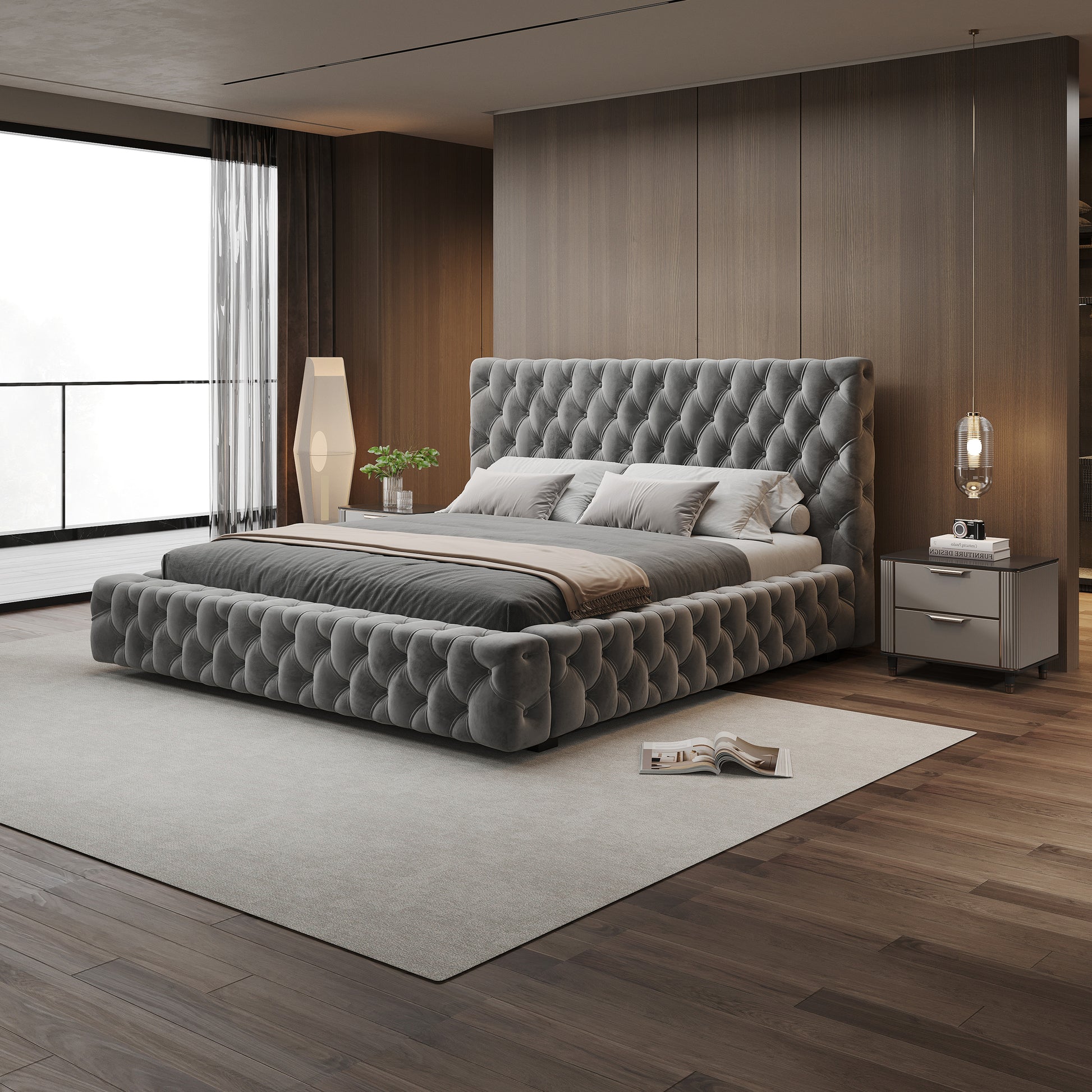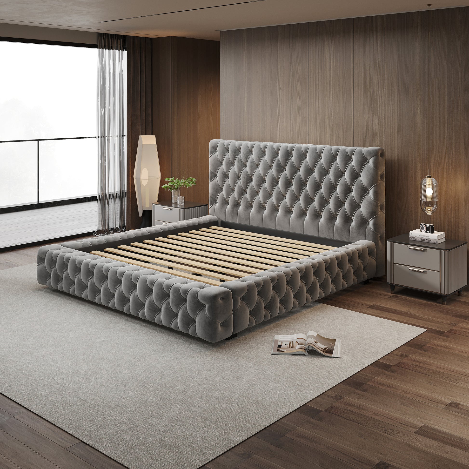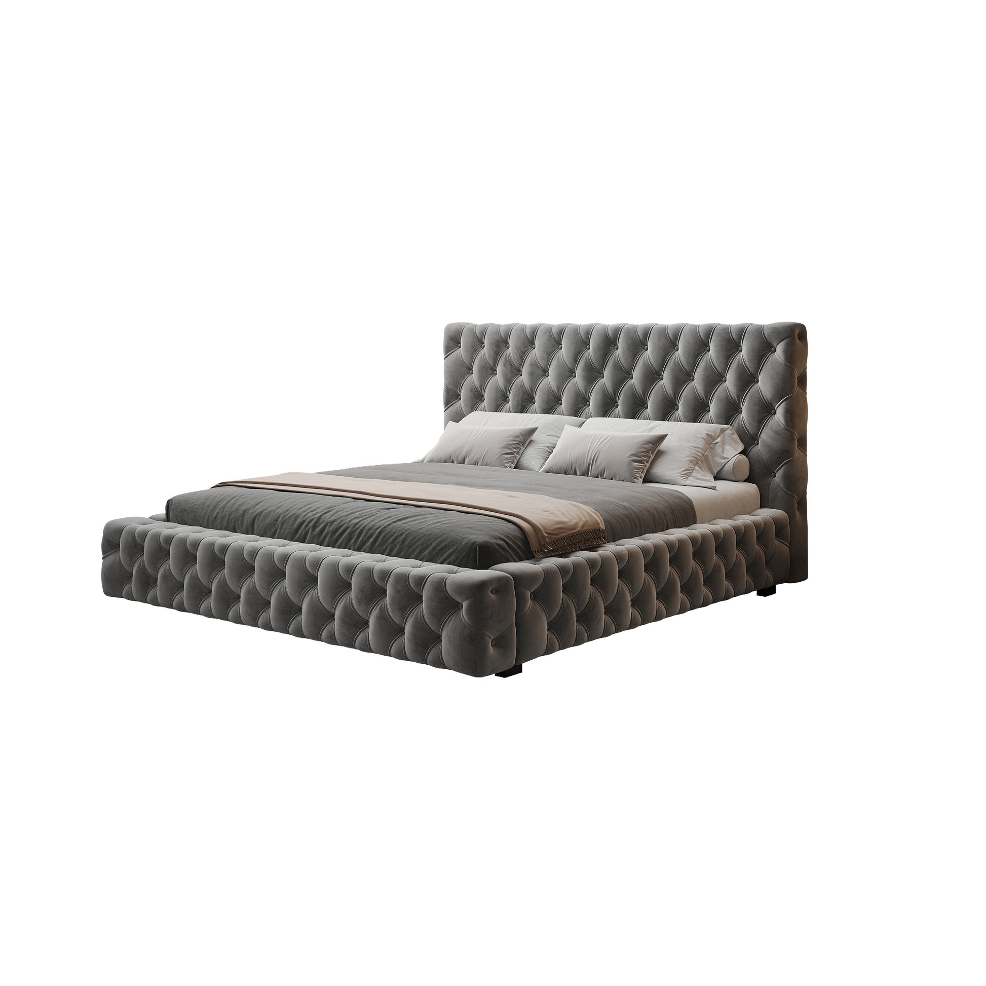 Anka Piano Bed Frame with Deep button tufting -Plush grey velvet