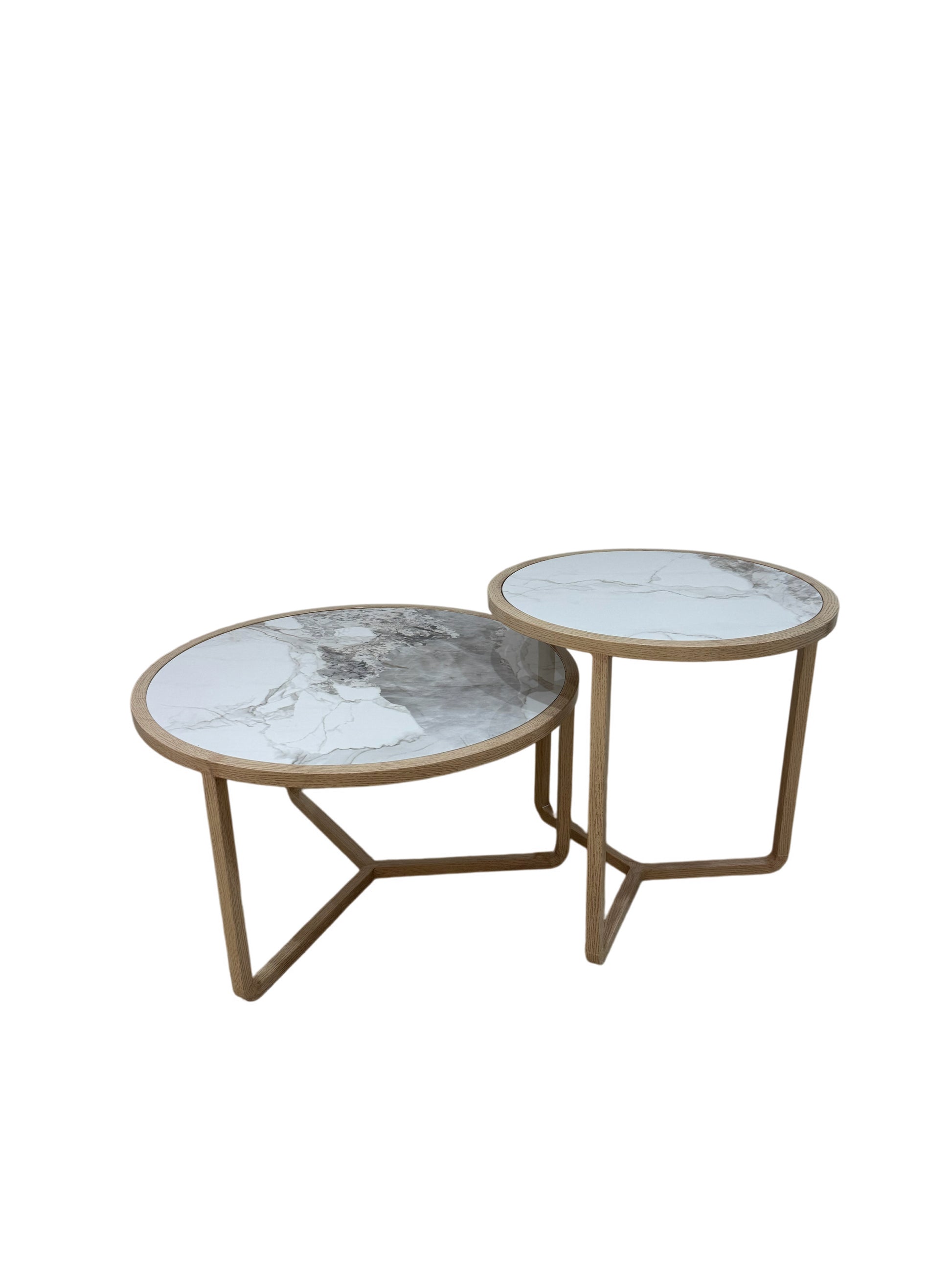 The Clara Coffee Table boasts a stunning white and grey marble stone surface, supported by sleek wooden legs. With its unique twin design, it adds a stylish and modern touch to any living space. Elevate your home decor with this elegant and functional piece.